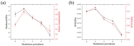 Mechanical properties of AlCrTiVNbN/TiSiN nano multilayer films: (a) hardness and elastic modulus values; (b) H/E and H3/E2..