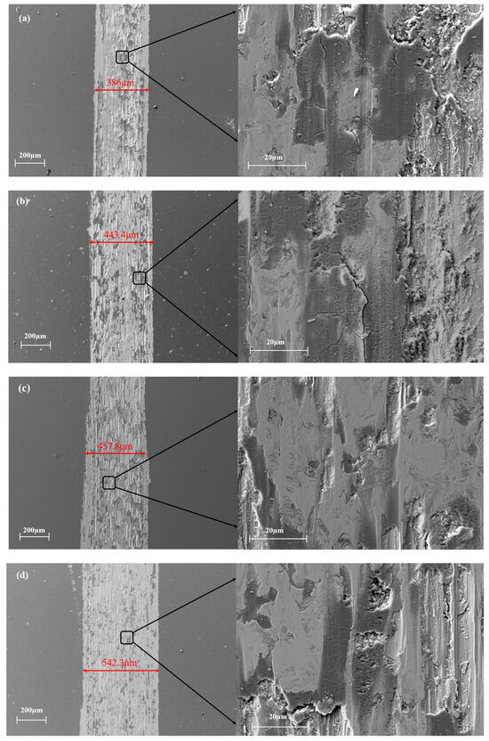 Wear track morphologies of AlCrTiVNbN/TiSiN nano multilayer films: (a) 4 nm, (b) 5 nm, (c) 6 nm, and (d) 7 nm.