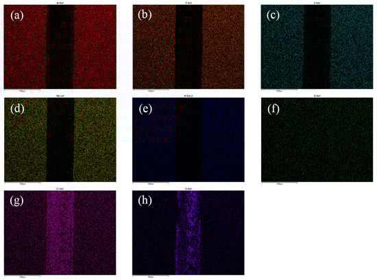 Element distribution on wear tracks of the AlCrTiVNbN/TiSiN nano multilayer film with λ = 4 nm: (a) Al, (b) Ti, (c) V, (d) Nb, (e) N, (f) Si, (g) Cr, and (h) O.