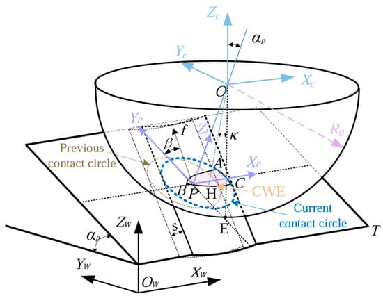 The CWE area is surrounded by three curves: AB, AC and BC. P is the cutter contacts point, which is located on the curve BC and makes contact with the machined surface. Among these, BC represents the intersection curve between the tool’s rotational surface and the machined surface at the transition of the current tool path. AB is the intersection curve between the tool’s rotational surface and the previously machined surface, while AC represents the intersection curve between the tool’s rotational surface and the surface to be machined, visually depicting the tool’s cutting trajectory into the workpiece. The feed direction of the tool is f, and the angle between it and the coordinate axis YP is the feed direction angle β. s is the cutting width, and αP is the machining angle. Let H denote an arbitrary reference point on the boundary of the contact area, κ denote the axial position angle of this point, and E represent the tool nose. The expressions of the boundary AB, AC, and BC of the contact area are as follows: