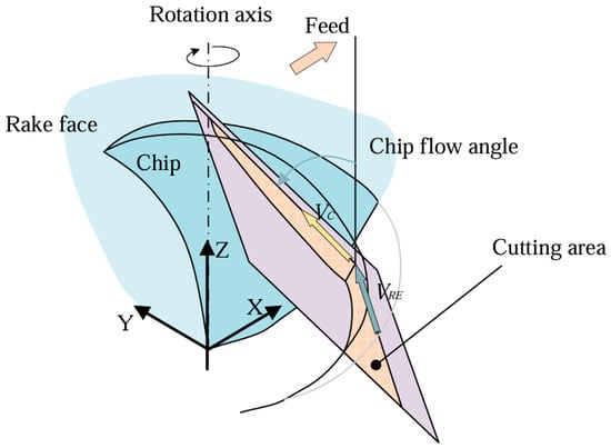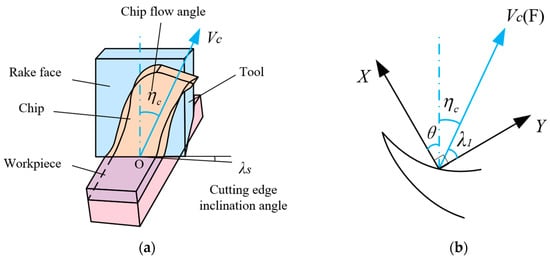denote the chip flow angle, λ1 represent the angle between the chip flow velocity Vc on the rake face and the Y-axis (perpendicular to the tool tip), which is related to the cutting speed, and θ signifies the projection of the main cutting edge angle onto the rake face.