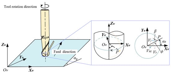 During the ball-end milling cutter process, the relative position between the cutter and workpiece continuously varies, leading to dynamic changes in the tool–workpiece contact relationship. To gain deeper insights into the relationship between tool cutting speed and chip flow velocity, a CWE model for ball-end milling cutter is first developed via geometric analysis and rigid body transformation. The CWE model [32] for three-axis milling of inclined planes is illustrated in Figure 1.