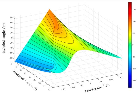 When the machining inclination angle αP is 15°, the variation in the included angle ϕ with the feed direction β, and axial angle κ is shown in Figure 5. It can be seen from the figure that the direction of cutting speed is obviously influenced by the tool posture. Overall, the cutting speed direction exhibits an irregular curved surface, indicating that both angles exert a significant influence on it. The influence of these two angles cannot be overlooked in the subsequent study of chip flow direction. When the axial angle κ is 0, it is found that the included angle ϕ changes linearly and is determined by a distinct protrusion point. Notably, the tangential velocity Vr at the tool nose is zero during tool tip engagement with the workpiece, so that the included angle variation depends solely on the feed direction.