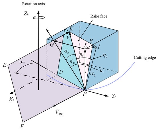 Figure 6 illustrates the cutting model at the cutting edge contact point. A cutting model incorporating cutting speed VRE and chip flow velocity Vc is established on the rake face PDKH. The chip flow angle ηc is the angle KPH on the rake face, the projected angle η′c is the angle GPL, and αe is the angle GPK, as defined by Equation (11):