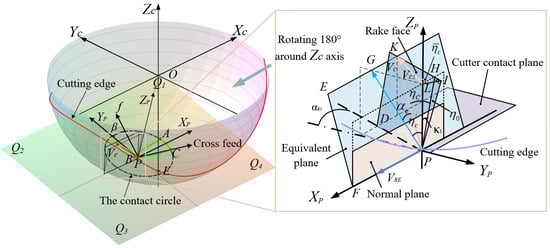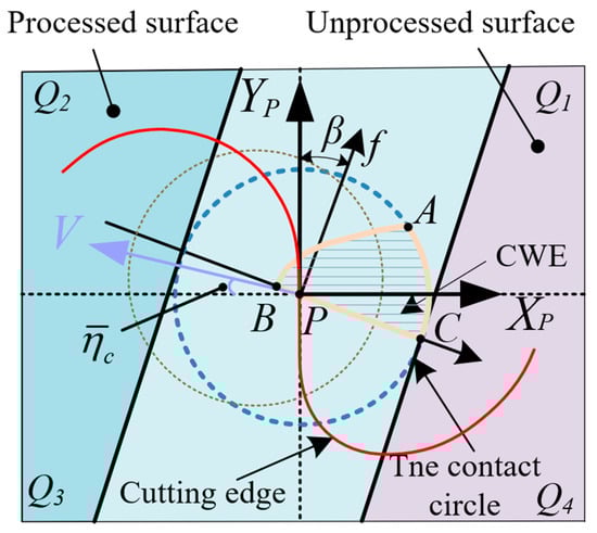 on the cutting plane is defined as the acute angle between the contact plane projection Vc1 of chip flow velocity Vc and cutting velocity VRE. To facilitate further research, the feed direction of the ball-end milling cutter is divided into four intervals (Q1, Q2, Q3, Q4) in the contact plane, corresponding to four directions, namely upper right, upper left, lower left, and lower right, respectively. When the feed direction angle β ∈ [−90°, 0°), f lies in Q1 (upper right); when β ∈ [0°, 90°), f is in Q2 (upper left); when β ∈ [90°, 180°), f is in Q3 (lower left); and when β ∈ [−180°, −90°), f is in Q4 (lower right). The cutting geometry analysis in any direction in the Q1 interval is shown in Figure 7. The tool contact point P is located on the curve BC in direct contact with the machined surface.