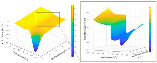 and the above two angles indeed exhibit a strong correlation, consistent with the preceding analysis. In the region where the axial angle κ is 0°, the chip flow angle undergoes a sudden change when the feed direction angle β is −112.5°. This change mirrors the trend of cutting speed VRE shown in Figure 5. This research trend is consistent with the findings of prior scholars, thereby verifying the effectiveness of the model. It was found that there is a distinction between positive and negative chip flow angles in the remaining region. According to theoretical analysis, the tool rotation motion is defined as the positive direction, and