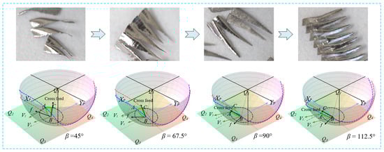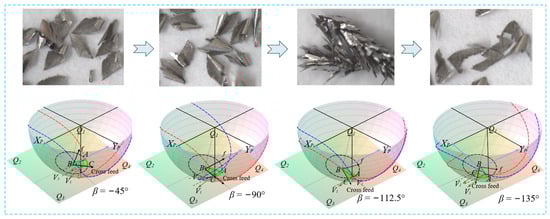 We also pay attention to the research of other scholars. Sonawane, H. A., et al. [33] proposed that the width and thickness of the chip are affected by the tool attitude. Matsumura, T., et al. [34] studied the relationship between the chip flow angle and the cutting force. This paper conducts a comprehensive analysis of the impact of tool posture on the chip flow angle and chip morphology, with the conclusions being consistent with those in the literature.
