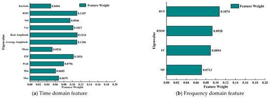 According to the above, the total sample size is 112 groups. A total of 30 kinds of eigenvalues are extracted from each group as input, and the feature selection based on Relief-F algorithm is carried out with the friction data as the guide output. The weight ratios of the thirty eigenvalues are illustrated in Figure 12. Specifically, Figure 12a presents the weight ratios of the time domain eigenvalues, Figure 12b depicts the weight ratios of the frequency domain eigenvalues, Figure 12c shows the weight ratios of the wavelet packet eigenvalues, and Figure 12d illustrates the weight ratios of the entropy eigenvalues.