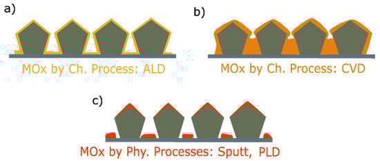 The main features related to the coating of metallic nanowires depend on the coating process. MOx homogeneity, surface coverage, and conformality on the AgNWs depending on the method employed, namely (Ch.) chemical processes ((a) atomic layer deposition (ALD) and (b) chemical vapor deposition (CVD)) and (Phys.) physical processes ((c) Sputt, Evap, and pulsed layer deposition (PLD)) [46].