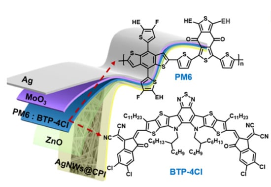 - Wang, Y.; Chen, Q.; Zhang, G.; Xiao, C.; Wei, Y.; Li, W. Ultrathin flexible transparent composite electrode via semi-embedding silver nanowires in a colorless polyimide for high performance ultraflexible organic solar cells. ACS Appl. Mater. Interfaces 2022, 14, 5699–5708. [Google Scholar] [CrossRef] [PubMed]