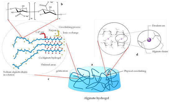 Schematic representation of an alginate hydrogel (a). It is formed following the gelation of a solution of sodium alginate, a biopolymer of natural origin, which is a linear copolymer formed by blocks of (1→4)-linked β-D-mannuronate (M) and α-L-guluronate (G) residues (b). When this solution encounters solutions of divalent cations, gelation occurs, by ion exchange between these cations and the sodium ions (c). The cross-linking is of the physical type, with divalent cations (Ca2+) forming ionic bonds with the polymer chains (d).