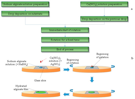 Spin-coating is a process that is used to apply a uniform film to a flat substrate. Its principle is to deposit a small amount of a solution of the species of interest, in this case alginate, on the substrate, which is then rapidly rotated to distribute the fluid over the substrate by centrifugal force [18]. The rotation is stopped as soon as the desired thickness is reached. When spin-coating is used for semiconductor, ceramic, or similar materials, the solvent is evaporated, thus enabling the formation of the desired film with a very thin thicknesses, even a few nanometers [19]. In the case of polymeric materials, factors such as the viscosity of the system must also be taken into consideration; the viscosity of the system increases significantly during the gelation phase.