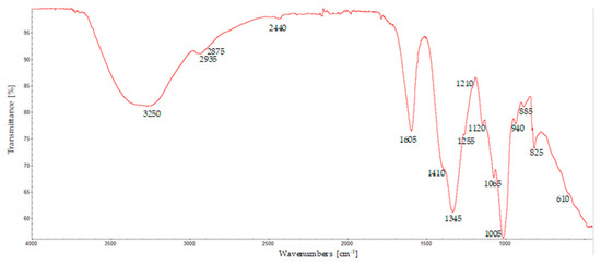 A typical spectrum of these films is shown in Figure 3 and it is very consistent with what has been reported in the literature [30], even if the sample has been mechanically detached from the support; this may induce some strain, which can be reflected in the FTIR spectrum, highlighting that the method is effective for the preparation of calcium alginate hydrogels.