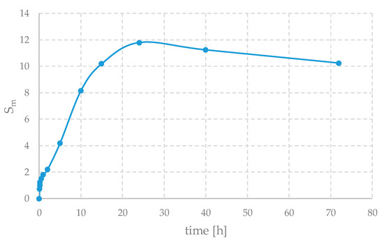 A small decrease in weight can also be observed after about 24 h; this may be due to a possible partial degradation of the sample and the fact that, gradually, some substances such as sodium nitrate that were initially present can be washed away. Furthermore, the swelling properties of alginate gels are highly dependent on factors such as pH, ionic strength, and the degree of cross-linking; therefore, even similar samples can behave quite differently. Thus, this curve should be seen as qualitative and only indicative of the behavior of these materials. In fact, to reduce experimental error—arising from the difficulty of handling these samples and from procedural issues (for example, mass loss during excess water removal or, conversely, residual water remaining on the surface)—the weight variation should be averaged over multiple samples.