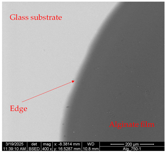 The images obtained by the BSE detector show differences in atomic number: the higher the atomic number is, the brighter the material appears in the image. Since silicon has more than double the atomic mass of carbon, in Figure 4, the bright region is the glass substrate, while the dark one is the hydrogel film.
