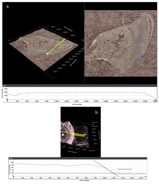 Calcium alginates are well known for their excellent water absorption and swelling capabilities. In fact, their swelling ratio can be as high as 30–50. In this case, due to the constraint of the presence of the substrate that prevents lateral swelling, it is lower, as shown in Figure 4, reaching only about 12.