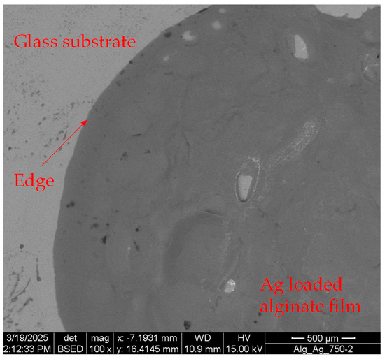SEM image of a Ag-loaded calcium alginate film prepared using a rotation speed of 500 RPM and an alginate concentration of 10 g/L and 0.2 M for Ca(NO3)2; meanwhile, the concentrations of AgNO3 and NaBH4 are 0.4 and 0.02 M, respectively.