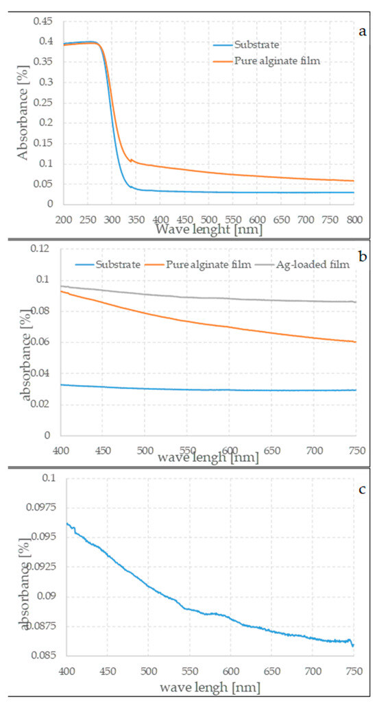 UV spectra of the substrate alone and of the pure-alginate film (a); UV spectra of the substrate alone, of the pure-alginate film, and of the film loaded with silver nanoparticles (b) in a narrower spectral range; magnification of the loaded film alone (c) to highlight the presence of a hump, which can be referred to in the data on the nanoparticles.