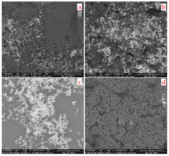SEM image of the sample Nano_Hy6 in different positions, showing the damaged gel matrix (a), the presence of inorganic phases (b), aggregates of Ag particles (c), and crystals with hexagonal formation which are rich in boron (d).