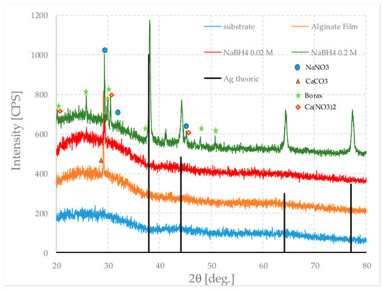 To gain further insight into the nature of these particles and the crystalline phases present and to gain structural information on the film, they were analyzed by XRD diffraction. Figure 12 shows the XRD patterns of the pure film and those loaded with silver particles, prepared using different concentrations of sodium borohydride, and that of the substrate as a reference. For clarity, only the theoretical pattern of silver is shown; however, the peaks, marked by symbols, are recognizable due to other inorganic crystalline phases (including, somewhat surprisingly, calcite, CaCO3). This may conceivably derive from the later alteration of calcium nitrate, whose peaks are in fact rather weak.