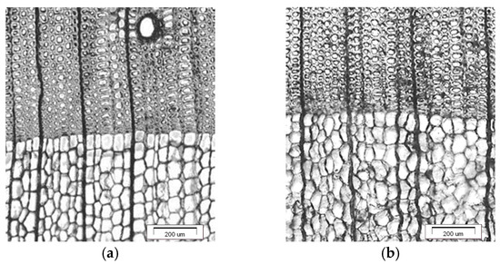 The sapwood of European larch differed in anatomical structure compared to the heartwood (Figure 2a,b). This is a typical feature of softwood [53,54]. These differences depend on a number of factors: genetic conditions, origin, habitat, growth conditions, age, position relative to the height, and diameter of the trunk [55,56].