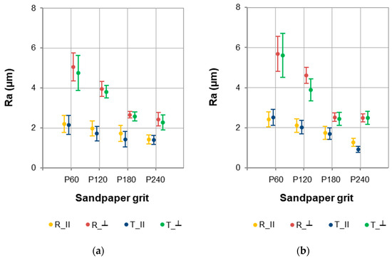 The influence of four factors on the roughness parameters of European larch wood was analysed. The Ra parameter values showed significant variation depending on measurement direction and sandpaper grit size (Figure 3). The sapwood was characterised by lower Ra values (Figure 3a) compared to the heartwood (Figure 3b), but these differences were not significant. Depending on the factors studied, the mean Ra values for sapwood were in the range of 1.401–5.053 µm, and for heartwood in the range of 0.922–5.682 µm.