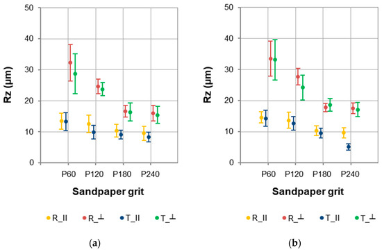 Similar dependencies for Ra were noted for the Rz parameter (Figure 4). However, the values were higher due to the nature of the Rz parameter (maximum height of the assessed profile). Depending on the factors studied, the mean Rz values for sapwood were in the range of 8.294–32.282 µm, and for heartwood in the range of 5.126–33.485 µm.