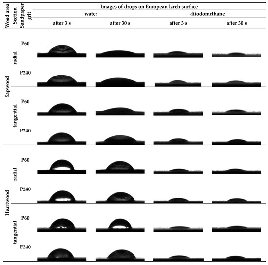 The contact angles at the phase boundary wood–water and at the phase boundary wood–diiodomethane showed significant changes depending on wood area (sapwood, heartwood), anatomical section (radial—R, tangential—T), and sandpaper grit. Images of both water and diiodomethane drops on European larch sapwood and heartwood after sanding with P60 and P240 sandpapers are presented in Figure 5. Sapwood was characterised by greater wettability than heartwood. This is primarily due to differences in the anatomical structure and chemical composition of the sapwood and heartwood [45].