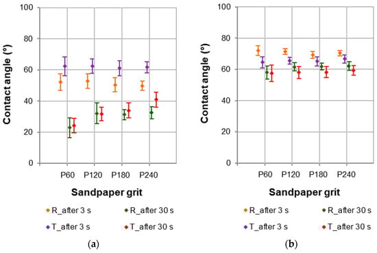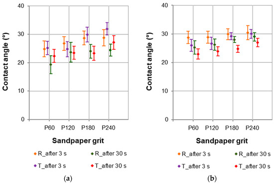 The variation in contact angle between 3 and 30 s reflects the dynamic nature of the wetting process. At the initial stage (3 s), the contact angle predominantly represents the early wetting phase, which is influenced by chemical composition, roughness, and surface energy. During this phase, the liquid droplet mainly interacts with the outermost surface features, including surface roughness, extractives, and microstructure. As time progresses (up to 30 s), the contact angle generally decreases due to liquid penetration into the wood’s porous structure, driven by capillary forces. This deeper interaction involves anatomical elements such as tracheids (in earlywood and latewood) and rays, which significantly influence the rate and extent of liquid absorption. Wood anatomy has a crucial role in this process. Earlywood, characterised by larger lumens and thinner cell walls, typically facilitates faster liquid uptake, resulting in a more rapid decrease in contact angle. In contrast, the denser structure and smaller lumens of latewood tend to restrict penetration, slowing the wetting process. Additionally, the orientation of the wood surface (radial, tangential) affects the availability and direction of capillary pathways. Tangential surfaces may offer less resistance depending on the distribution and orientation of earlywood, which is evident in the case of the contact angle tests for heartwood (Figure 6b). Time-dependent changes in contact angle can also be influenced by the chemical composition of the surface, particularly the presence of natural extractives or modifications introduced through sanding. Extractives may form hydrophobic layers that hinder initial wetting, but over time, these compounds can be displaced or dissolved by the liquid, leading to a further decrease in contact angle.