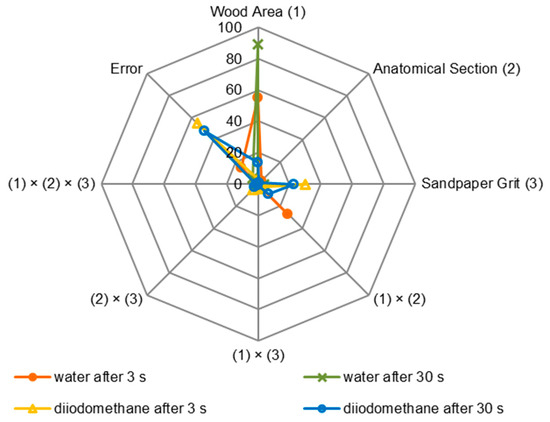 The statistical evaluation of the influence of factors on the contact angles at the phase boundary wood–water (Figure 8) showed that the wood area had the greatest impact. Significantly, this influence increased from 55% to 89% when examining the contact angle after 3 s and 30 s. It was shown that the interaction between the wood area and the wood section significantly influenced the formation of the contact angle determined after 3 s with water. The impact of this interaction was 27%. The percentage impacts of factors on the contact angles at the phase boundary wood–diiodomethane were analysed (Figure 8), and it is worth noting that sandpaper grit showed the greatest impact. This impact was at the level of 30% after determining the contact angles after 3 s and at the level of 23% after determining the contact angles after 30 s.