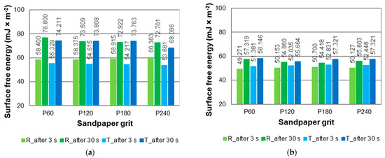 Surface free energy (SFE) describes the tendency of a solid surface to interact with liquids and is closely related to wettability. In wood, SFE is influenced by both chemical composition and structural characteristics such as surface roughness. However, as noted by Liptáková and Kúdela [60], interpreting both contact angle and SFE in wood is inherently challenging due to the material’s porous structure and its ability to absorb liquids during measurement. This dynamic interaction can lead to time-dependent changes in wetting behaviour and affect the calculated values.