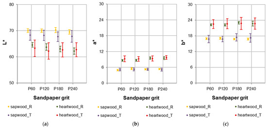 Colour parameters: (a) L*, (b) a*, (c) b* for European larch wood.