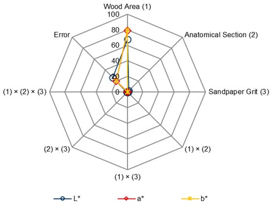 The conducted research showed that sanding the surface of European larch wood with P60–P240 sandpapers changes the texture of the wood, but it does not significantly differentiate the colour parameter values, i.e., L* (Figure 10a), a* (Figure 10b), b* (Figure 10c), after sanding. The only factor differentiating the colour was the wood area. This factor determined the L* parameter values in 68%, the a* parameter values in 79%, and the b* parameter values in 80% (Figure 11). Analysing the statistical evaluation of the factors influencing the colour parameters of European larch, it can be clearly seen that the wood area determined the colour parameters. Differences in the colour parameters values between species resulted from the presence of extractive compounds, i.e., differences in the chemical composition of wood [61]. The influence of sandpaper grit on the L*, a*, and b* parameters values was not statistically significant.