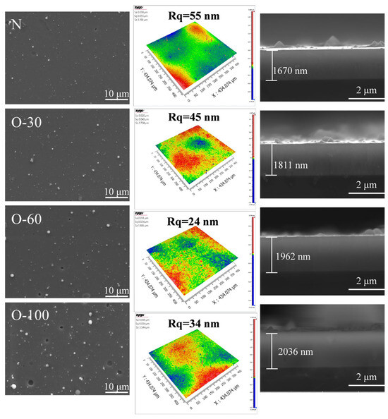 The surface and cross-sectional morphologies, along with the surface roughness, of the coatings are shown in Figure 1. A small number of large particles were present on the surface of the nitride coating, with a surface roughness of 11.5 nm. After the introduction of oxygen at 30 sccm and 60 sccm, the surface morphology showed no significant change, but the surface roughness decreased markedly, reaching 1.36 nm for the O-60 coating. When the oxygen flow rate reached 100 sccm, the number of large particles on the coating surface increased, their size became larger, and obvious pore defects appeared, resulting in an increased roughness of 3.45 nm. The primary reason for this phenomenon is that at higher oxygen flow rates, the target surface reacts with oxygen to form oxides, leading to target poisoning. Consequently, the active area on the target surface decreases, the arc current density increases, exacerbating the ejection of liquid droplets from the target [17,18]. All coating cross-sections exhibited a dense and uniform morphology, with no detectable significant defects such as pores or cracks.