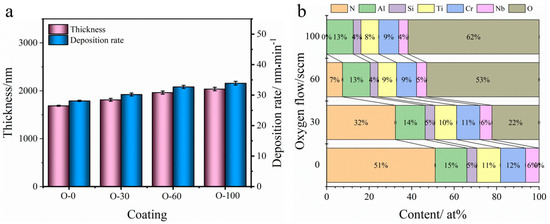 (a) Thickness and deposition rate and (b) elemental content changes of AlCrNbSiTiN coatings with different oxygen flow rates.