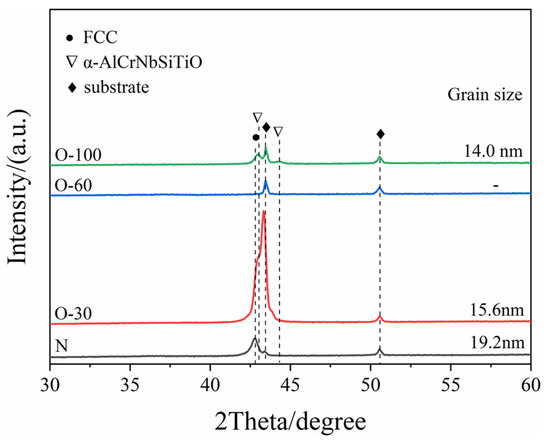The XRD patterns of the coatings are shown in Figure 3. The JCPDS reference numbers for XRD results are 65-2899 and 88-2324. For the nitride coating, only the FCC (200) diffraction peak was detected, indicating a preferred orientation of (200), suggesting that coating growth is primarily controlled by surface energy. The reason is that during preparation, substrate rotation interrupts the continuous bombardment by high-energy ions, thereby reducing the coating’s strain energy and stopping energy, making surface energy the dominant factor controlling coating growth. In the O-30 coating, the intensity of the FCC (200) diffraction peak significantly increased. Similar results were observed by Ahmad et al. [19] in their study on oxygen incorporation into AlCrN coatings. This is related to the reduction in surface energy. Oxygen atoms have higher electronegativity than nitrogen atoms. Therefore, oxygen incorporation enhances polarization, reduces surface energy, and strengthens the preferred orientation of (200) [17]. Additionally, the change in peak shape for O-30 is also related to lattice defects caused by the substitution of nitrogen ions by oxygen ions in the charge balance mechanism [20,21]. No diffraction peaks other than those from the substrate were detected in the O-60 coating, indicating a completely amorphous structure. With a further increase in the oxygen flow rate, diffraction peaks corresponding to α-AlCrNbSiTiO were detected in the coating. Grain sizes were calculated using the Scherrer formula. The grain sizes for the N, O-30, and O-100 coatings were 19.2 nm, 15.6 nm, and 14 nm, respectively. With the increase in oxygen content, oxygen doping leads to severe lattice distortion, and the angle of the diffraction peaks shifts to the right. Therefore, the interplanar spacing decreases. The crystal plane index of the diffraction peaks remains unchanged. Therefore, the lattice parameters are directly proportional to the crystal plane spacing, and the lattice parameters decrease.