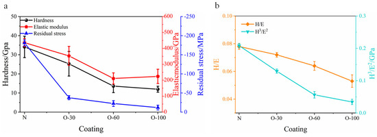 (a) Residual stress, hardness, and elastic modulus and (b) changes in H/E and H3/E2 ratios for the coatings.