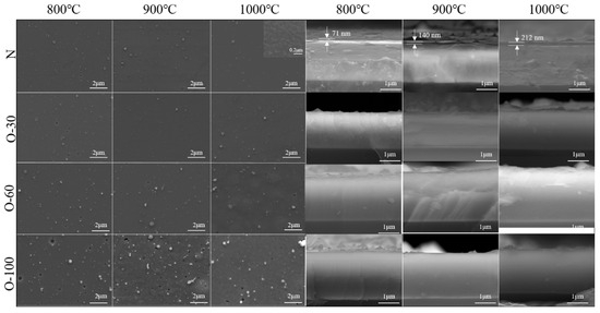 Figure 5 shows the surface and cross-sectional morphologies of the coatings after oxidation at 800–1000 °C. For the AlCrNbSiTiN coating, no significant changes were observed on the surface after oxidation at 800–900 °C. After oxidation at 1000 °C, fine oxide particles sized between 100 and 200 nm were observed in high-magnification SEM images of the coating surface. A dense oxide film was detected on the coating cross-section, with a thickness of 71 nm at 800 °C. As the oxidation temperature increased to 1000 °C, the oxide layer thickness increased to 212 nm, demonstrating excellent oxidation resistance. For the oxygen-incorporated coatings, the cross-section of the O-30 coating showed no significant change throughout the oxidation temperature range. Many “blisters” appeared on the surface of the O-60 coating after oxidation at 1000 °C. This is due to poor adhesion between coatings and substrates; the coating partially delaminated from the substrate under thermal stress, forming locally uplifted features. Blisters also appeared on the O-100 coating after oxidation at 900 °C, and signs of coating spallation were found on the surface. No significant changes were observed on the coating cross-sections.