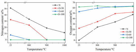 Changes in coating composition after oxidation are shown in Figure 6. For the nitride coating, as the oxidation temperature increased, the coating continuously reacted with oxygen to form an oxide layer, consuming N within the coating. At 1000 °C, the N content in the coating decreased to 11.5 at.%, while the O content increased to 47.5 at.%. The N content in the O-30 and O-100 coatings dropped to zero at 900 °C and 800 °C, respectively. The oxygen content in the O-30 coating continued to increase with temperature, reaching 52.2 at.%. In the O-60 coating, the oxygen content increased to 63 at.% at 900 °C and remained essentially unchanged upon further temperature increase, indicating oxygen saturation in the coatings. The oxygen content in the O-100 coating remained largely constant with increasing temperature, suggesting an oxygen saturation concentration in the coating of 63 at.%.