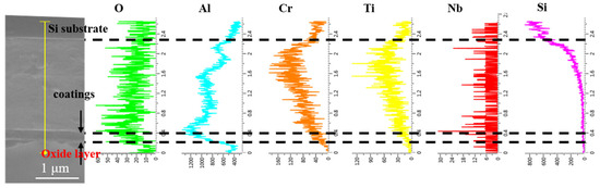 To further investigate the elemental diffusion behavior during oxidation of the coatings, the AlCrNbSiTiN coating, O-30 coating, and O-100 coating were selected for EDS line scan analysis on their cross-sections after oxidation at 1000 °C. The AlCrNbSiTiN coating sample used a silicon substrate for convenient cross-section preparation. For the O-30 and O-100 coatings, due to poor adhesion to the silicon substrate, coating delamination occurred easily during sample preparation. Therefore, Focused Ion Beam (FIB) technology was used to prepare cross-sections on stainless steel substrates. As shown in Figure 7, for the AlCrNbSiTiN coating, significant enrichment of Al and O elements was observed in the oxide layer, indicating that the coating’s oxide layer is primarily composed of Al2O3.