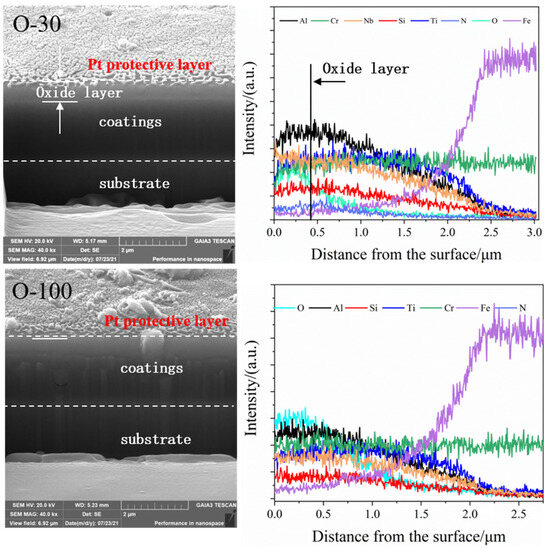 As shown in Figure 8, for the O-30 coating, a delaminated layer approximately 400 nm thick can be seen at the top of the FIB-prepared cross-section. According to the EDS line scan results, this layer shows enrichment of O and Al, indicating that the top layer is mainly Al2O3. For the O-100 coating, the morphology of the FIB-prepared cross-section and the EDS line scan results show no enrichment phenomenon for any element. The reason is that the oxygen concentration of the O-100 coating is already near saturation. The coating exhibits excellent stability, and elemental diffusion is difficult in a high-temperature oxidizing environment.