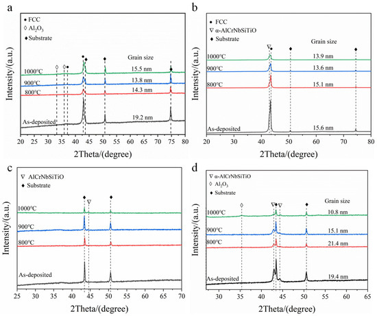 To study the structural changes during coating oxidation, XRD tests were performed on the coatings after oxidation at different temperatures, with the results shown in Figure 9. For the AlCrNbSiTiN coating, XRD after oxidation at 800–900 °C only detected a decrease in the intensity of the (200) diffraction peak, with no new phases appearing. At 1000 °C, weak diffraction peaks of Al2O3 were detected in the coatings. The grain size calculated by the Scherrer formula changes at different oxidation temperatures. The grain size of the coatings remained stable up to 1000 °C without coarsening. The diffraction peak intensity of the O-30 coating gradually decreased with increasing oxidation temperature and shifted towards the positions of the AlCrNbSiTiO diffraction peaks. The O-60 coating remained amorphous after oxidation at 800–900 °C. When the oxidation temperature increased to 1000 °C, diffraction peaks of AlCrNbSiTiO appeared in the coating. For the O-100 coating, the phase structure showed no significant change after oxidation at 800–900 °C. After oxidation at 1000 °C, diffraction peaks of Al2O3 appeared in the coating. As the temperature rises, the diffraction peaks of the coating shift towards the position of the AlCrNbSiTiO diffraction peaks, and the angle of the diffraction peaks increases. Therefore, the interplanar spacing decreases, and the lattice parameters decrease. Similar to the nitride coating, the oxygen-incorporated coatings also maintained their nanostructure at high temperatures without significant coarsening.