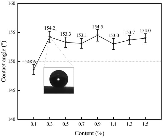 The effect of sodium laurate solution concentration on the wettability of the coating surface is shown in Figure 2. When the concentration is 0.1%, the WCA measures 148.6°, indicating hydrophobic behavior. At concentrations ranging from 0.3% to 1.5%, the WCA exceeds 150°, with no significant increase observed as concentration rises. This suggests that once superhydrophobicity is achieved, further increases in solution concentration minimally impact surface wettability. Notably, at 0.3% concentration, the average WCA reaches 154.2°, confirming superhydrophobicity. Considering coating fabrication costs, 0.3% sodium laurate solution was selected as the optimal concentration for preparing superhydrophobic coatings in subsequent experiments.
