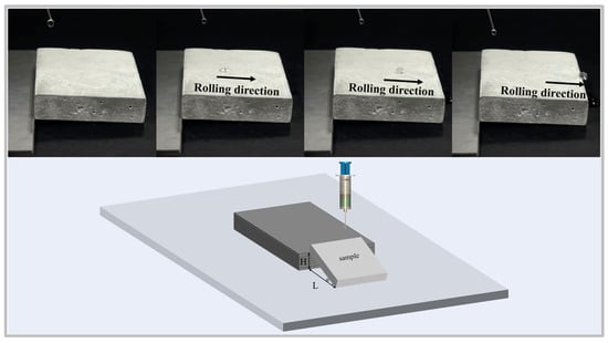 The sliding angle (SA) was measured by incrementally adjusting the inclination of the specimen [19]. Initially, the specimen was placed against multiple steel plates of equal thickness (1 mm). A 10 μL water droplet was gently deposited onto the surface from a height of 1 cm using a syringe. The tilt angle was progressively reduced through systematic removal of steel plates. This process continued until the droplet failed to roll off smoothly. The critical tilt angle at this transition point was recorded as the SA. Calculate according to the following formula: