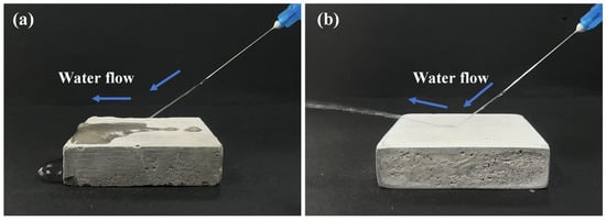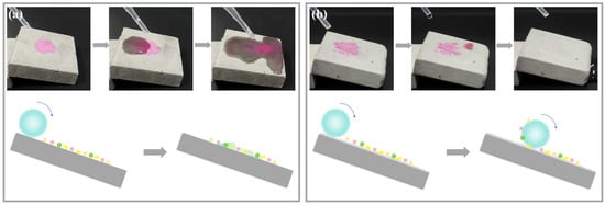 The self-cleaning effect of the superhydrophobic coating primarily originates from its unique surface structure, which enables efficient removal of inorganic pollutants (e.g., dust and soil) through water droplet roll-off under inclined conditions [27]. Figure 8 compares the self-cleaning performance between uncoated and superhydrophobic-coated specimens. As shown in Figure 8a, contaminated droplets on the uncoated specimen surface exhibit strong wetting behavior, leading to pollutant spreading and persistent surface contamination. In contrast, Figure 8b demonstrates that pollutants on the superhydrophobic-coated specimen adhere to rolling droplets and are completely removed through continuous droplet impact. These results confirm the exceptional self-cleaning capability of the coating, effectively eliminating surface dust on cementitious materials while maintaining long-term cleanliness.