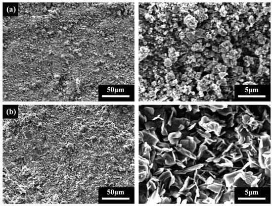 To explore the surface morphology of the superhydrophobic coating, the surfaces of a uncoated specimen and a superhydrophobic-coated specimen were examined using a scanning electron microscope (SEM) at magnifications of 500× and 5000×, respectively. Micro-nano rough structures were observed on the superhydrophobic coating surface. As shown in Figure 5a, the uncoated specimen exhibits a rough surface with irregular pores and cracks. In contrast, Figure 5b reveals a uniform layer of reaction products formed on the superhydrophobic coating surface after spraying with 0.3% sodium laurate solution. At 5000× magnification, these products display a flake-like hierarchical structure, attributed to the reaction between sodium laurate and calcium hydroxide in cement, which forms calcium laurate deposits on the cement-based substrate. The reaction mechanism is expressed as follows [26]:
