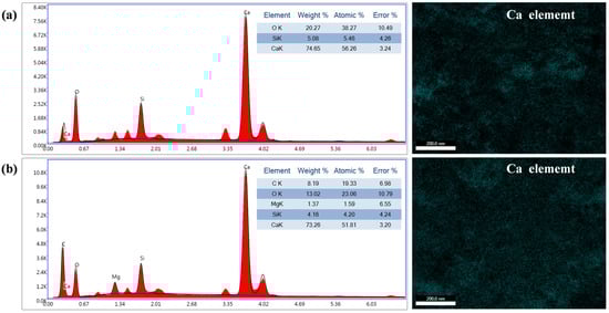 To investigate the elemental composition and distribution of the superhydrophobic coating, EDS analysis was conducted on both uncoated and superhydrophobic-coated specimens. As shown in Figure 7a, the surface of the uncoated specimen primarily contains O, Si, and Ca elements, with Ca exhibiting the highest concentration (74.65%). In contrast, Figure 7b reveals that the superhydrophobic-coated specimen surface contains Ca, O, C, Si, and Mg, where Ca remains predominant (73.26%) and C content reaches 8.19%. The marked increase in C content confirms the formation of calcium laurate (C12 alkyl chains), which imparts low surface energy and superhydrophobicity.
