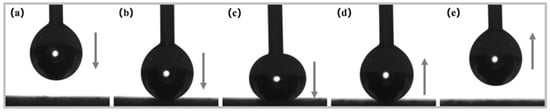 Droplet adhesion analysis: A 4 μL water droplet was formed on the needle tip of the contact angle goniometer. The droplet’s interaction with the coating surface (approaching, contacting, extruding, and detaching) was manually controlled to assess adhesion behavior [16].