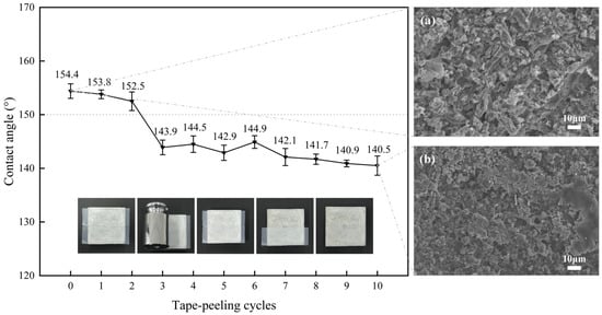 The adhesion durability of the superhydrophobic coating to cementitious substrates was evaluated via cyclic tape peeling tests with post-peel contact angle measurement. Figure 10 illustrates the dynamic relationship between the WCA and peeling cycles. Initial superhydrophobicity (WCA > 150°) was maintained through two cycles, followed by a decline to 143.9° at three cycles, marking a transition to hydrophobic behavior. After 10 cycles, hydrophobicity persisted with WCA values ≥ 140°. SEM imaging revealed compressive deformation-induced flattening of calcium laurate flakes (Figure 10a,b) and progressive material loss via tape adhesion, both contributing to roughness reduction and superhydrophobicity loss. This explains why the WCA of the coating decreased with increasing peeling cycles. The coating retained hydrophobicity after 10 cycles, attributed to the low-intensity mechanical damage induced by tape adhesion. This demonstrates that the sodium laurate-derived superhydrophobic coating exhibits both substrate adhesion and moderate resistance to mechanical peeling stresses.