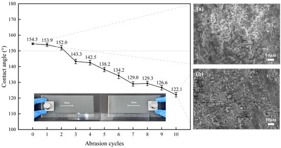 Variation of surface contact angle of superhydrophobic coating with the number of friction cycles and the SEM images of the surface before and after friction: (a) Before friction, (b) After friction.
